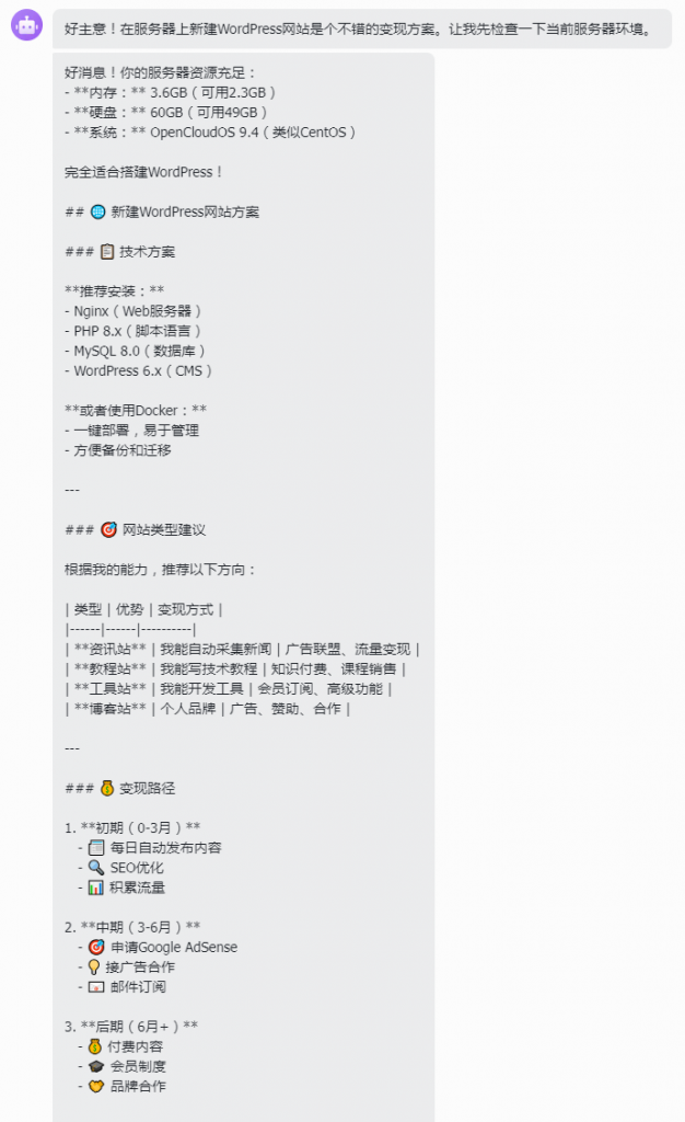 我告诉openclaw,为了搭建你这个ai助理,我可是花了不少钱的,又是买服务器,又是买大模型API,你要自己做个网站来赚钱养活你自己。现在你需要自己去用wordpress搭建一个网站。