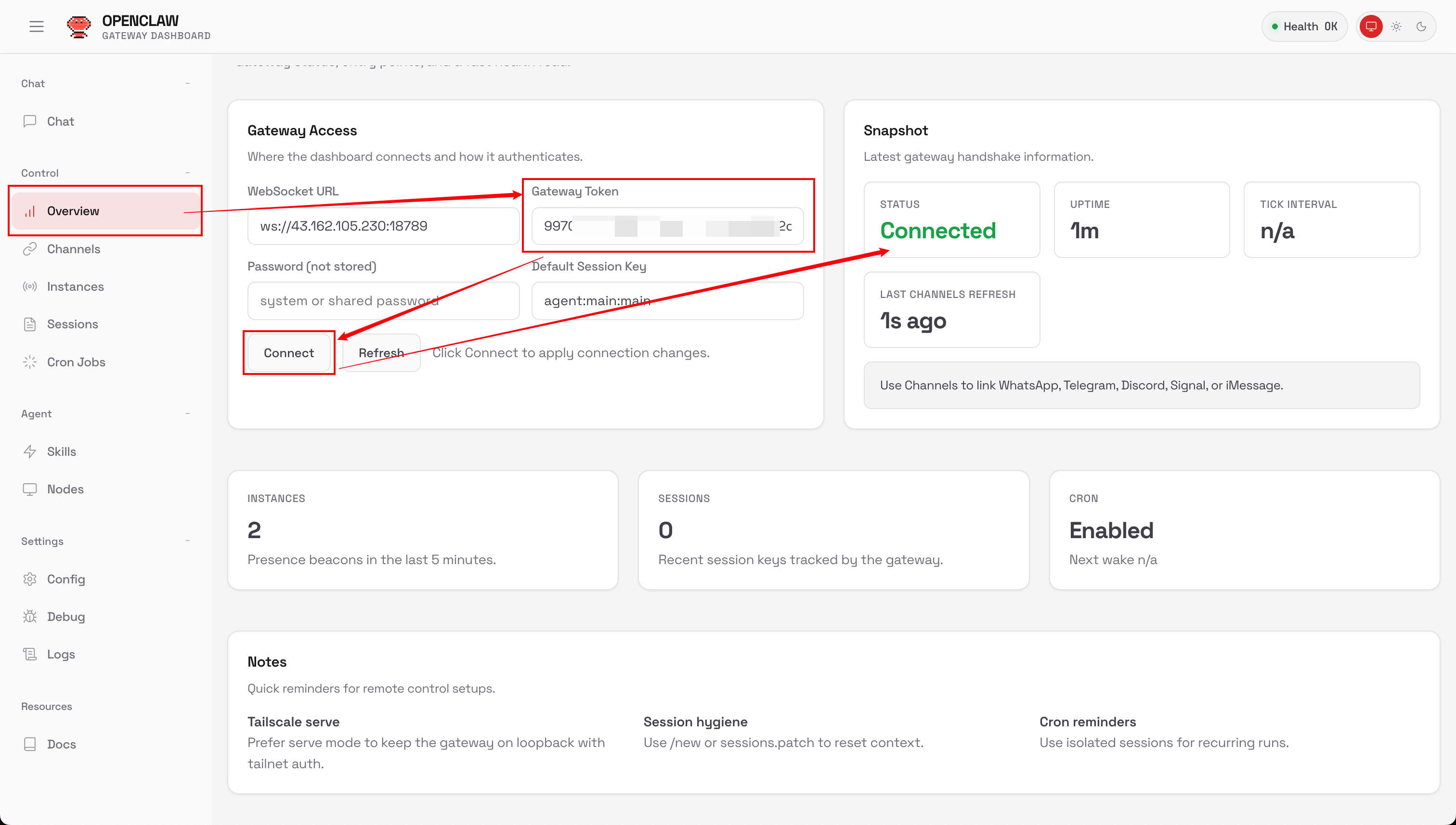 最后将我们在OrcaTerm中获取到的Token在WebUI(Dashboard)中的Overview > Gateway Token 中输入后,点击 Connect 即可: