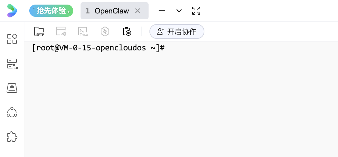 参考远程登录服务器部分的内容,前往轻量云Lighthouse控制台即可找到选购或重装完成的OpenClaw实例,点击页面内的登录按钮,使用OrcaTerm终端登录服务器,效果如下: